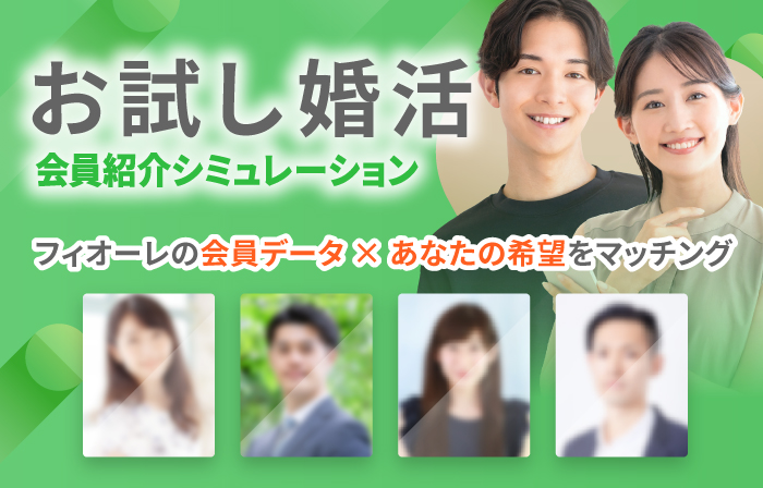 結婚相談所フィオーレでは、自分の希望条件が実際にどのような人なのか、リアルな会員さまとお試しでマッチング体験いただける「お試し婚活マッチングシミュレーション」を無料で提供しております。結婚相談所を判断する第一歩目として是非ご活用ください!